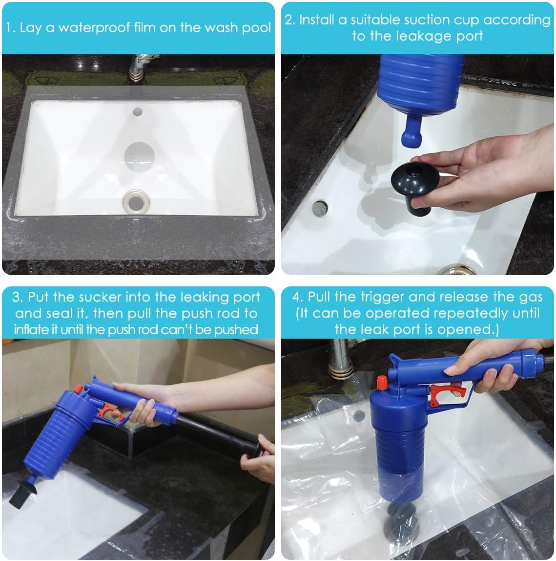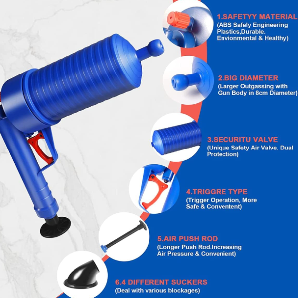 - ⚡️ Brzo i efikasno: Zaboravite na čekanje. Pištolj deluje u trenu, razbijajući začepljenja snagom pritiska vazduha.