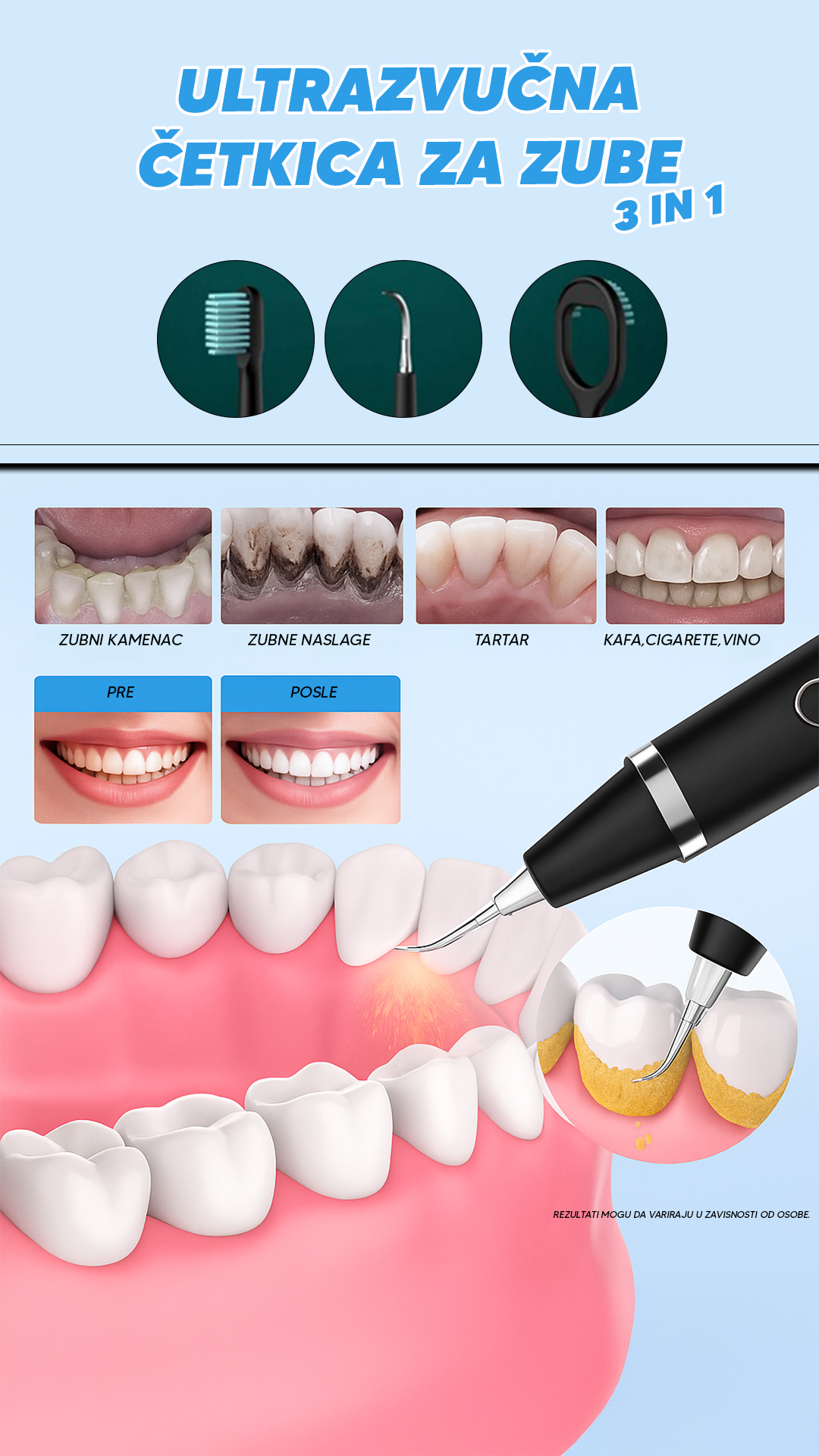 Predstavljamo vam inovativnu ultrazvučnu četkicu za zube sa tri zamjenjive glave, dizajniranu za kompletnu i temeljnu oralnu higijenu.
